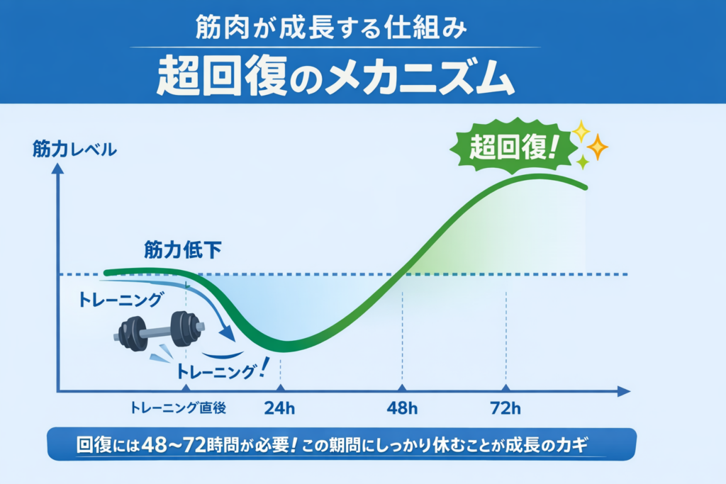 では、なぜ筋肉痛がある時に休むことが「正解」なのでしょうか。その答えは、筋力トレーニングの最も重要な原則である「超回復(ちょうかいふく)」にあります。