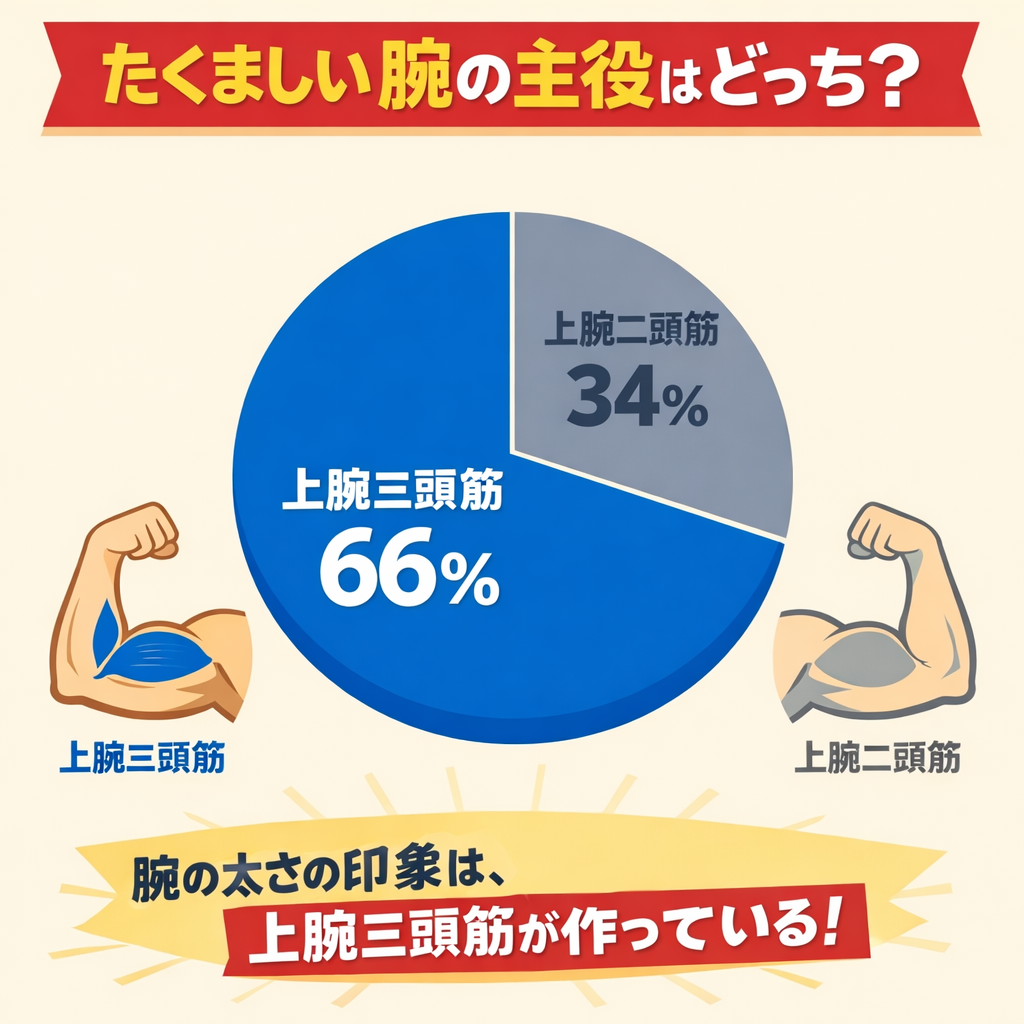腕の太さの約3分の2は、実はこの上腕三頭筋が占めています。つまり、Tシャツの袖をパンパンにする一番の近道は、上腕二頭筋よりもはるかに大きい上腕三頭筋を効率的に鍛えることなのです。
