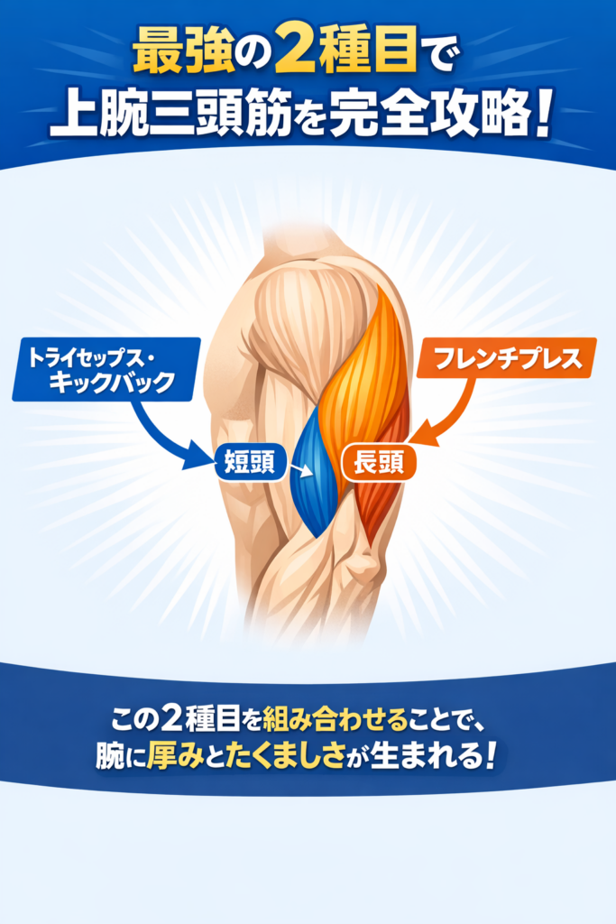 その理由は、上腕三頭筋が持つ3つの部位(長頭、短頭)を、この2種目でバランス良く鍛えられるからです。トライセップス・キックバックは上腕三頭筋の短頭(外側頭・内側頭)を、フレンチプレスは特に長頭を強く刺激します。つまり、この2種目は、上腕三頭筋全体を発達させるための、非常に効率的な補完関係にあるのです。