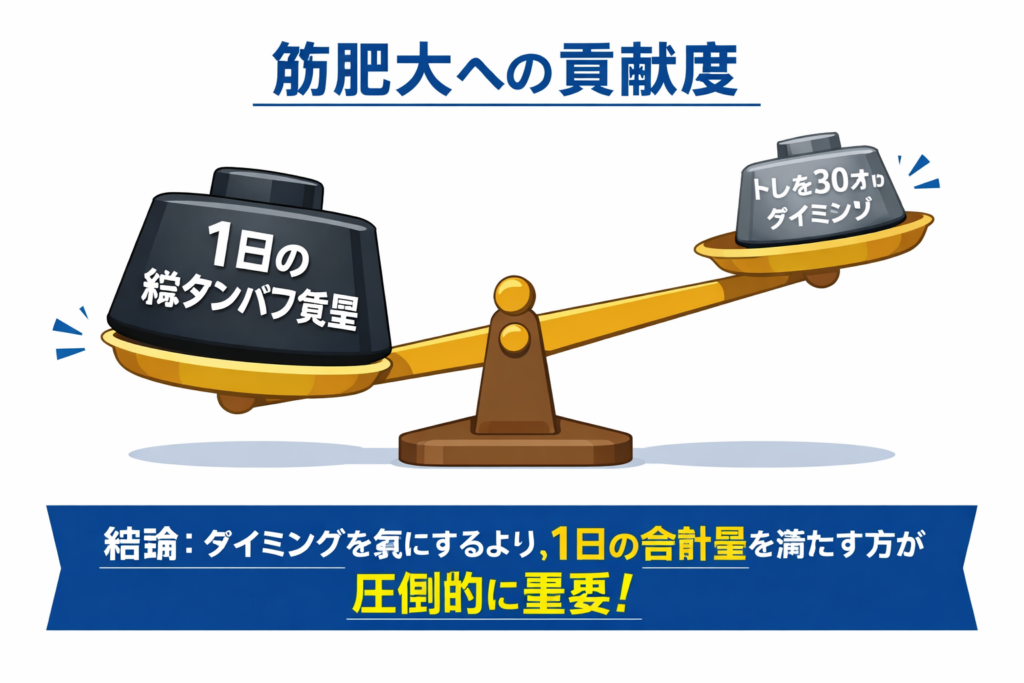 それは、筋肥大への貢献度において、プロテインを飲むタイミング(アナボリックウィンドウ)よりも、1日に必要なタンパク質の総量をしっかり摂ること(総タンパク質摂取量)の方が、圧倒的に重要であるということです。