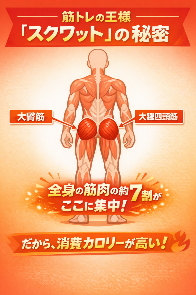 特にスクワットは、まさに筋トレの王様です。スクワットという一つの動作で、お尻(大臀筋)や太もも(大腿四頭筋)といった、体の中で最も大きくて力の強い筋肉をまとめて鍛えることができます。 体の筋肉の約7割は下半身に集中しているため、スクワットは非常に燃費の良い、効率的なトレーニングと言えます。