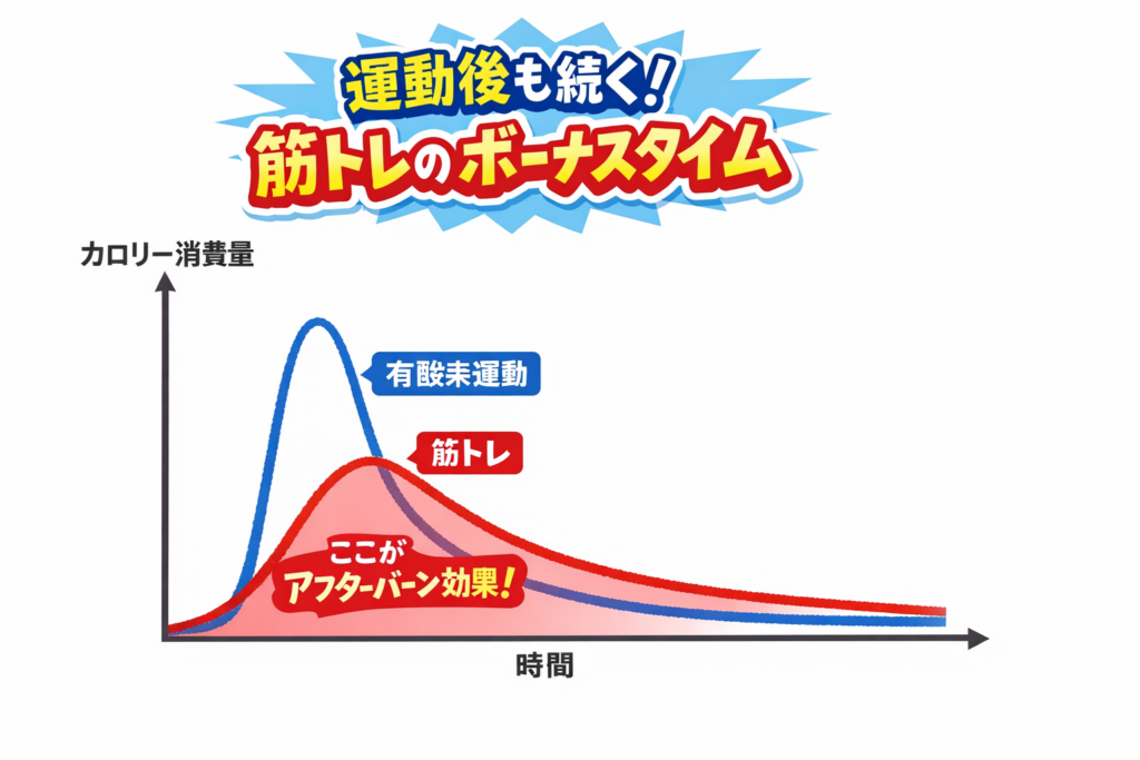 先ほど、「運動中の消費カロリーだけを見るのは半分」とお伝えした理由が、ここにあります。筋トレには、運動が終わった後も数時間から最大で48時間、体がカロリーを消費し続ける「アフターバーン効果」という、うれしいボーナスタイムが存在します。