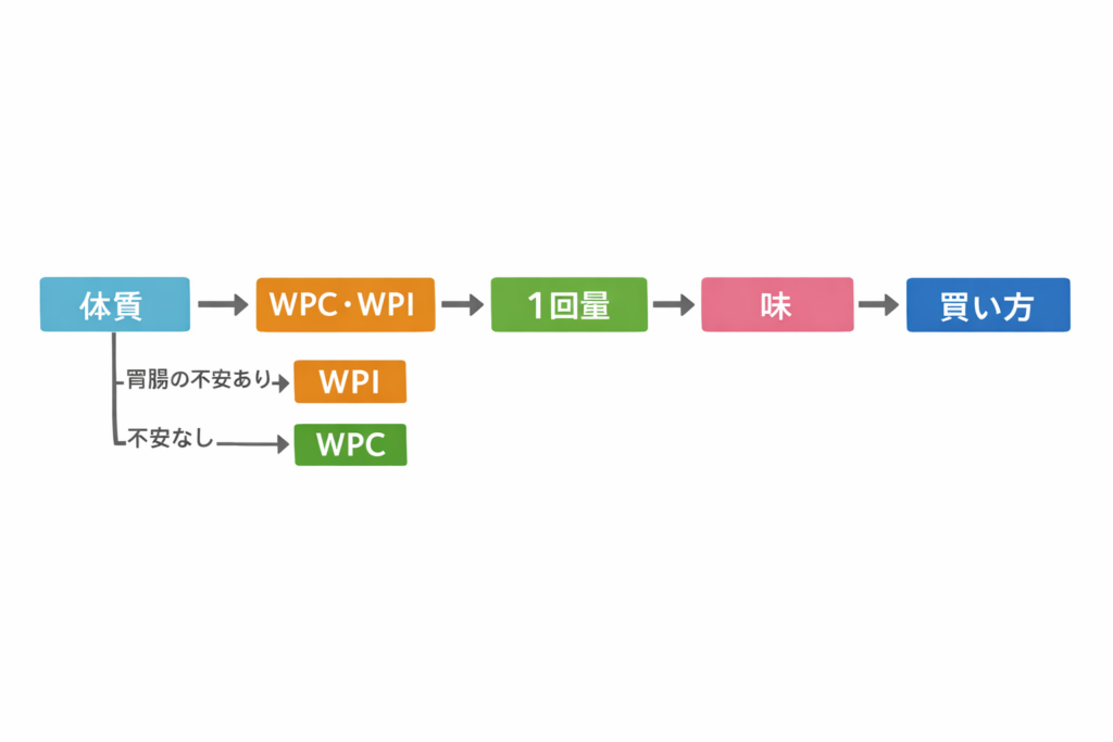この不安を最短で減らす道は、体質を先に確かめて「WPCかWPIか」を決め、次に1回量の枠を置いて、最後に味と買い方で微調整することです。口コミはその後で十分です。