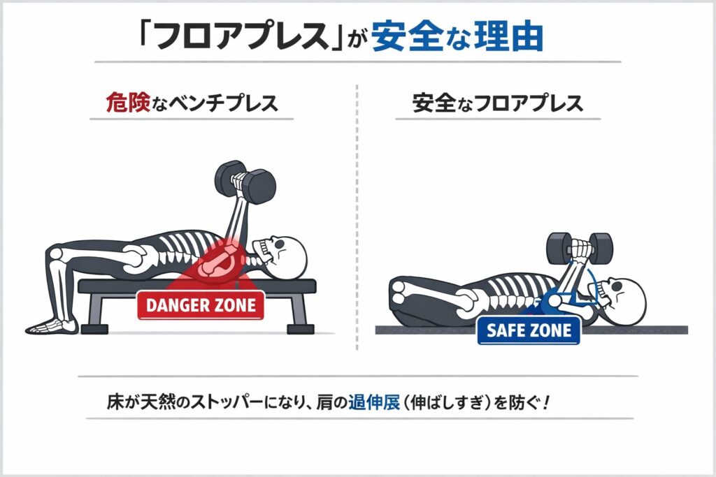 最大の理由は、床が肘の可動域を物理的に制限してくれる点です。ダンベルベンチプレスで最も怪我をしやすいのは、ダンベルを深く下ろしすぎて肩関節に過度なストレッチがかかる局面です。ダンベルフロアプレスでは、肘が床についた時点で動作がストップするため、この危険な領域にそもそも入れません。つまり、床があなたの肩を守る「天然のストッパー」の役割を果たしてくれるのです。 - 理由2:体が床に固定され、フォームが安定しやすい