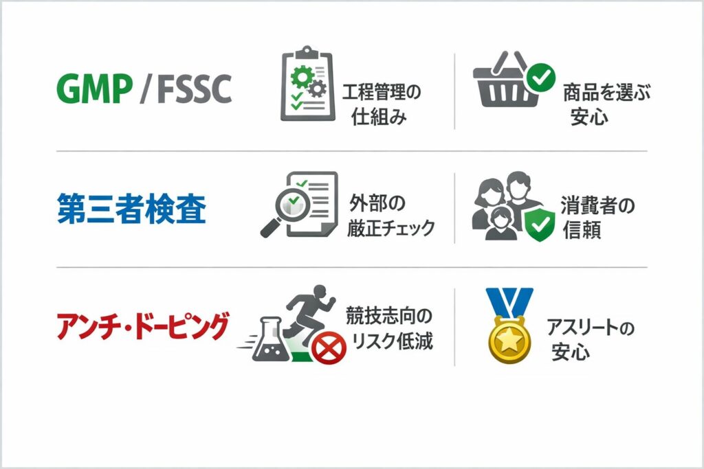 具体的には、GMP(適正製造規範)やFSSC 22000のような食品安全マネジメントの考え方は、「何となく安全そう」ではなく「製造工程の管理を仕組みで担保しているか」を見るための手がかりになります。もう一つ、競技志向の人や大会に出る人は、アンチ・ドーピング認証の有無が“買い替えのリスクを減らす材料”になります。