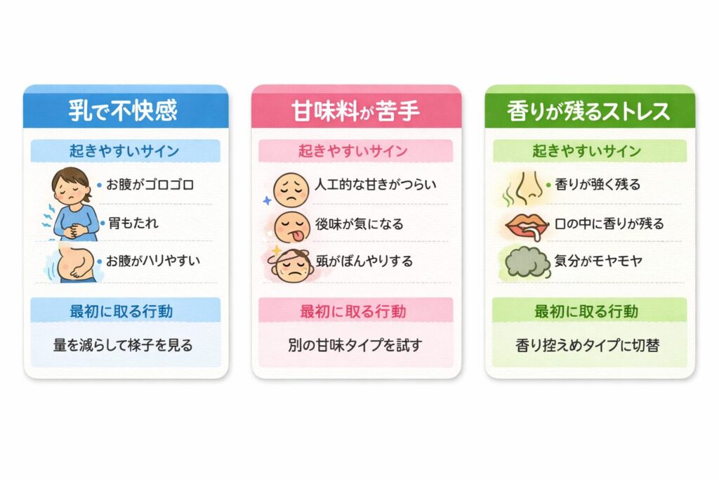 ここで重要なのは、体質の不安を後回しにしないことです。高いプロテインほど「せっかく買ったから飲まないと」と無理をしやすく、結果として体調不良を招くことがあります。プロテインは継続が前提なので、合わない兆候が出た時点で“止める判断”ができる設計にしておく方が安心です。