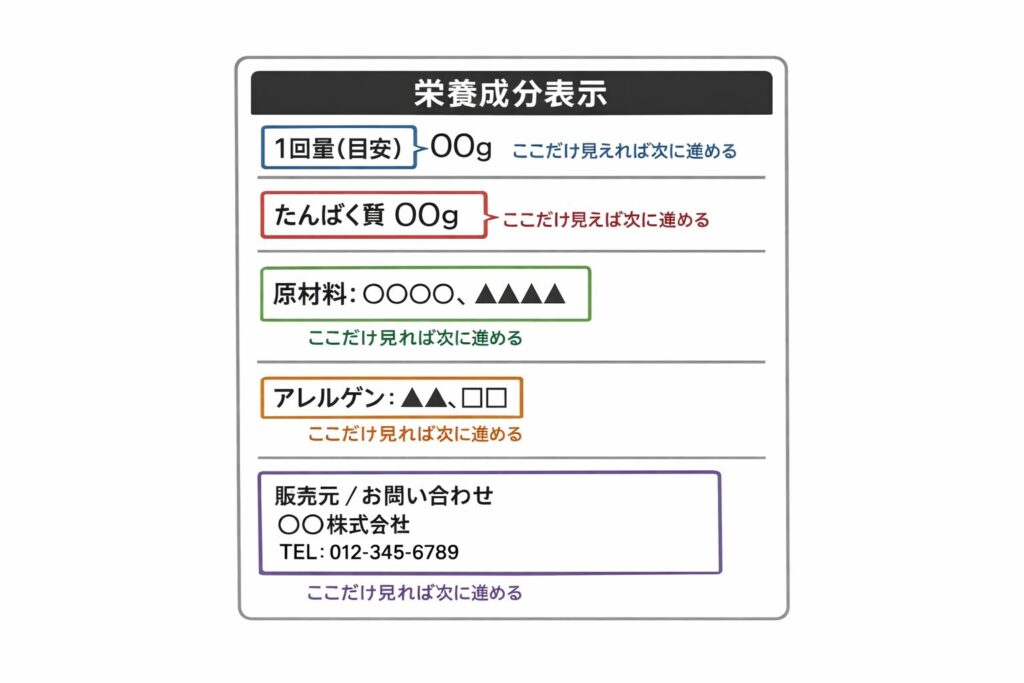 購入前に一番安心に直結するのは、ラベルと公式商品ページに必ず載っている情報です。見る順番は「1回量あたりのたんぱく質」→「原材料・アレルゲン」→「販売元や問い合わせ先」。この3点が確認できるだけで、「正体が分からない」不安はかなり小さくなります。