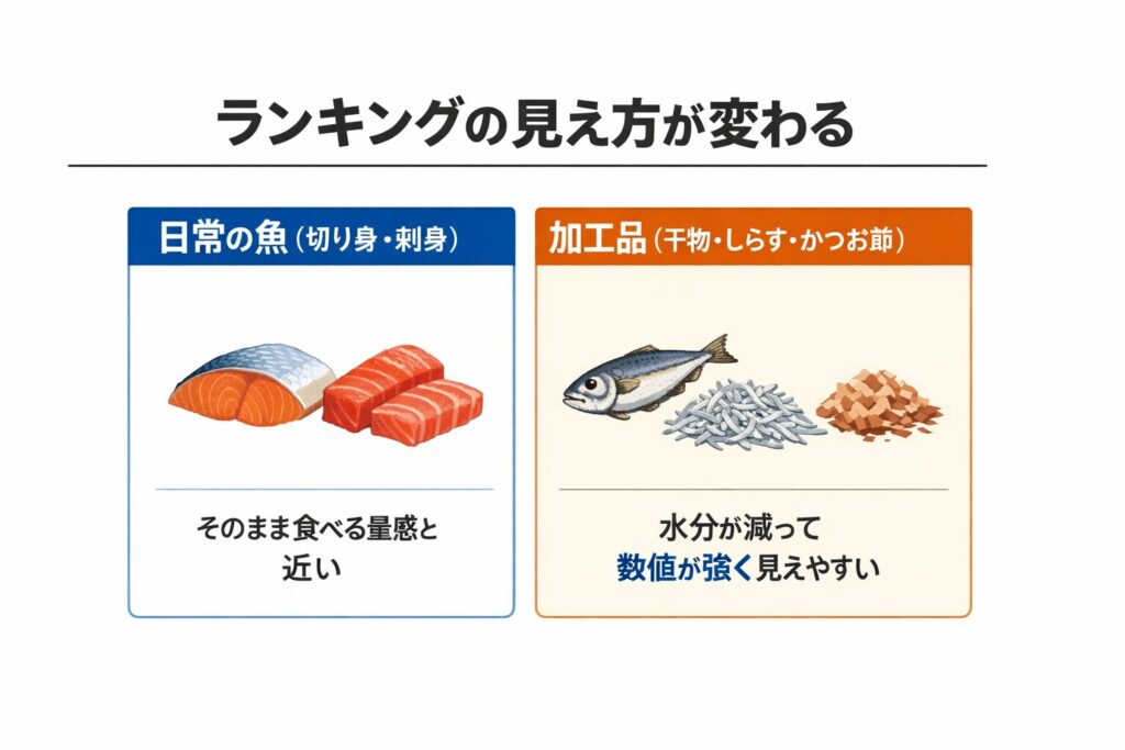 切り身・刺身で比較しているのか、干物や節のような加工品が混ざっているのか。混ざっている場合、加工品が上に来るのは自然です。