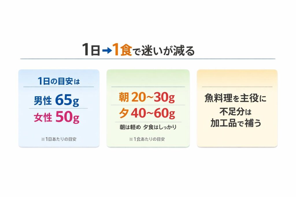 魚を選ぶ前に、タンパク質の“必要量”がぼんやりしていると、ランキングの順位に振り回されます。