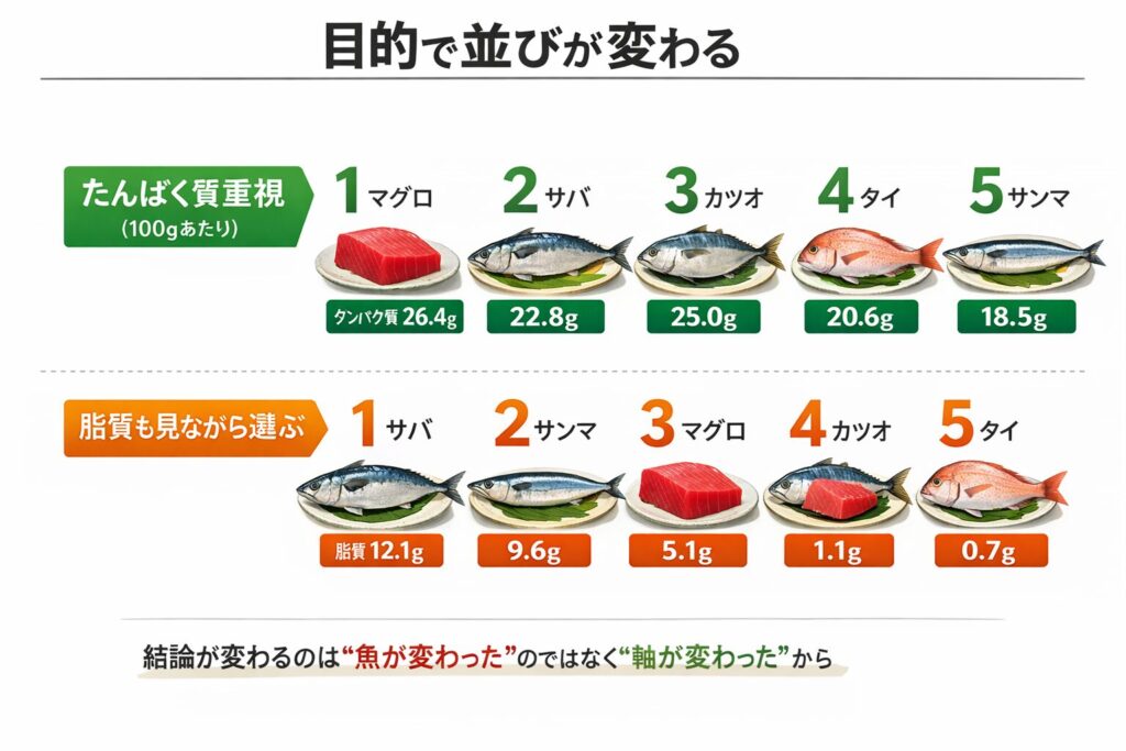 ただ、魚のタンパク質は「比べ方」を混ぜると、いきなりズレます。ズレたまま上位だけ追うと、体型管理のつもりが逆方向に進んだり、「思ったより積めていない」状態になりがちです。