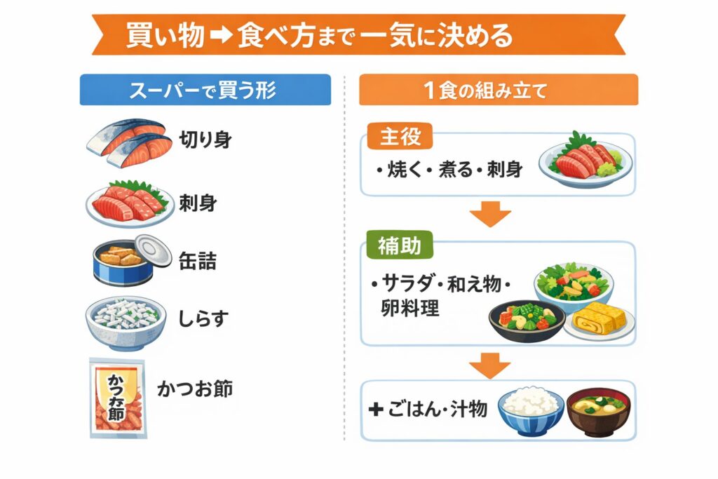 魚で迷いを減らしたいなら、週の中で「魚の日の型」を作り、他の日は別のタンパク源で調整するほうが現実的です。