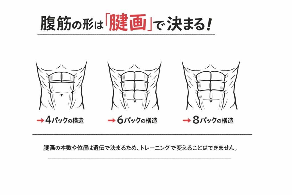 重要なのは、遺伝が腱画の本数や位置を決定するという事実です。生まれつき腱画が3本あれば6パックに、2本しかなければ4パックに見える、というわけです。これは、あなたが生まれ持った身長や骨格と同じ「身体の設計図」であり、後天的なトレーニングで腱画を増やし、4パックを6パックに変えることは、解剖学的に不可能です。