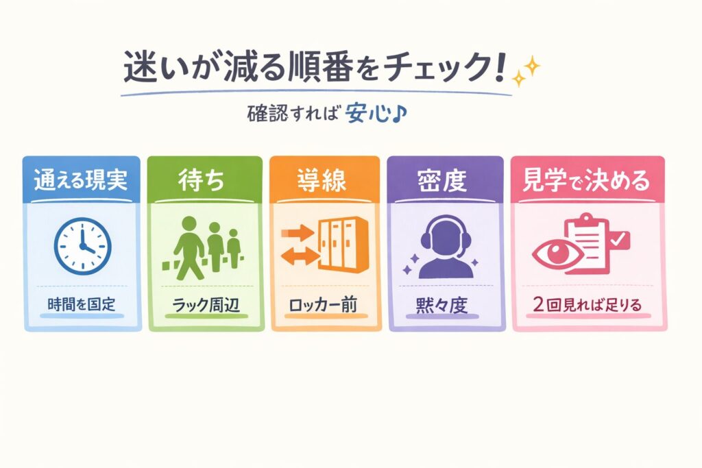 逆算はシンプルです。「自分が現実に行ける時間帯」を一つ決め、その時間帯で成立するかを確認する。成立するなら、細部は入会後に慣れます。成立しないなら、どれだけ良い口コミがあっても続きません。