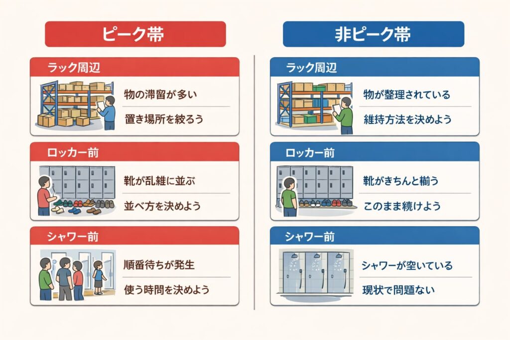 観察ポイントは、ラック周辺の滞留、ロッカー前の滞留、シャワー前の滞留。この3つだけで十分です。ここが許容できれば、細かい設備差は大きな問題になりにくい。