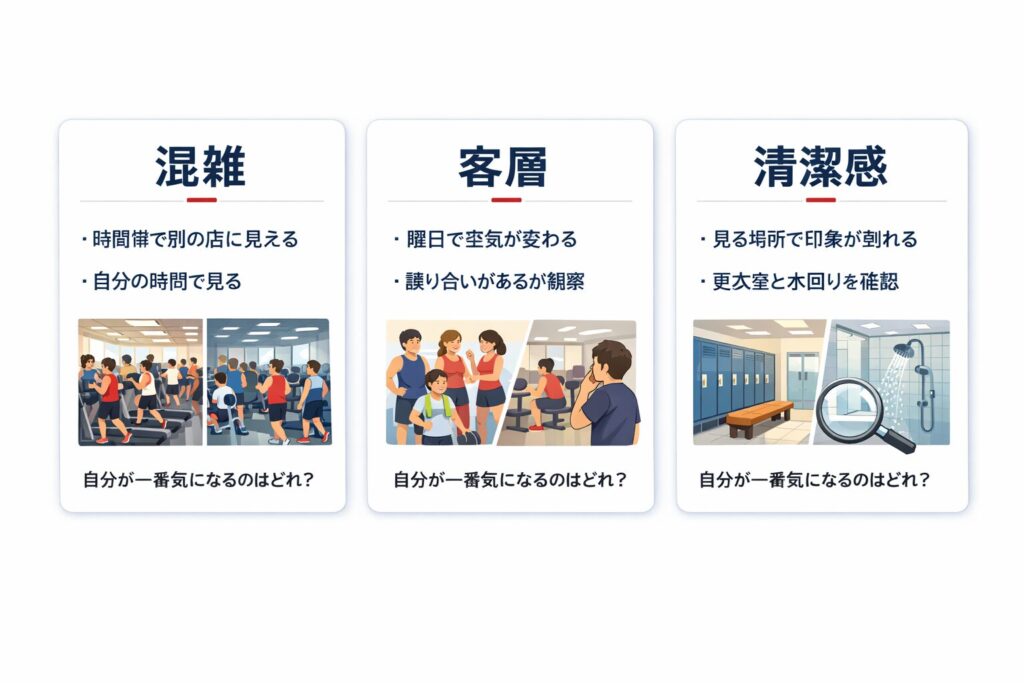 | 休日 | 人の多さで落ち着かない | 更衣室・水回り・受付周り | 「休日はどのあたりが混みますか?」 | 混んでもストレスが積み上がらないか |