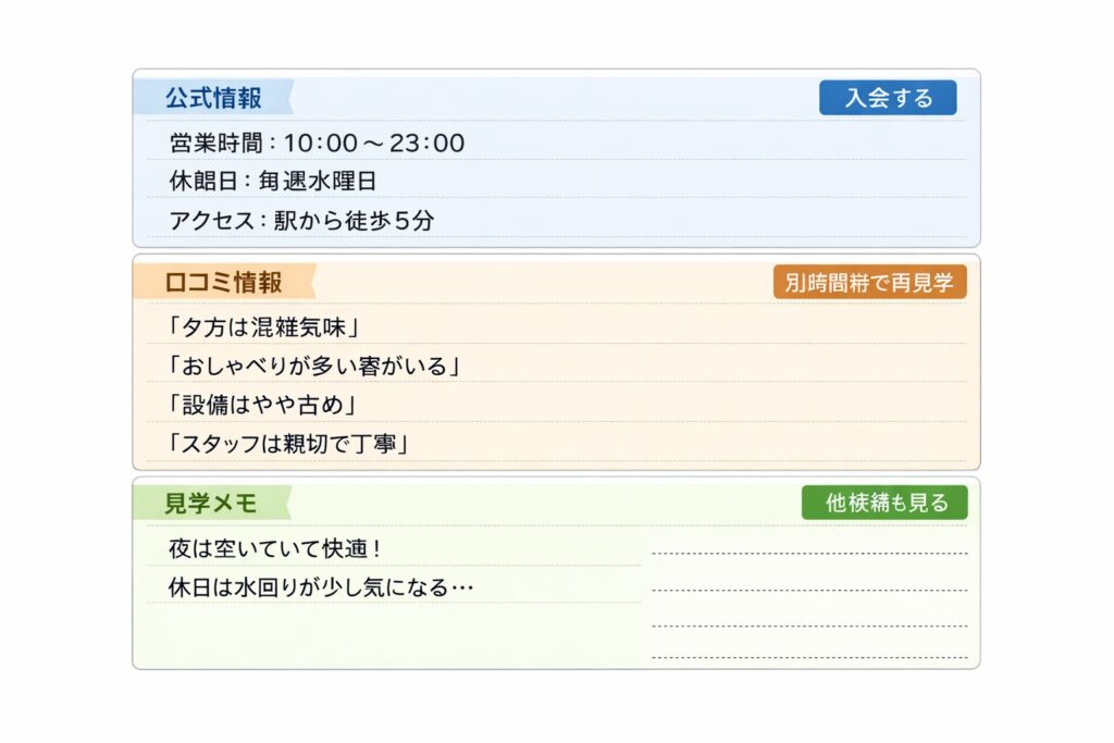 表で固定したいのは、口コミが割れやすい理由です。口コミは同じ店舗でも「書いた人の時間帯」「見ている場所」「求めていること」が違います。前提が揃っていないまま読むと、良い口コミも悪い口コミも、どちらも自分の判断を濁らせます。