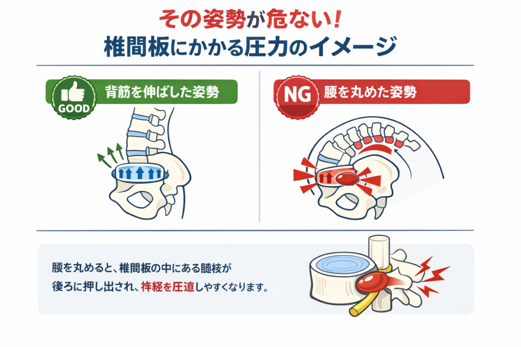 例えば、昔ながらの上体起こし腹筋運動は、腰を強く丸めるため、椎間板に強い圧力をかけてヘルニアを悪化させるリスクが非常に高い代表的なNGトレーニングです。
