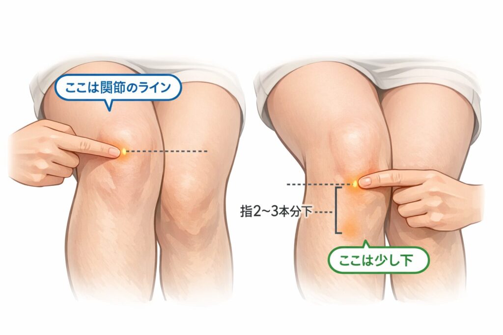 階段の上り下り、しゃがみ込み、ラン後の着替えなど「膝を曲げ伸ばしする動き」で痛みが目立つ人は、この位置をまず確認すると整理しやすくなります。