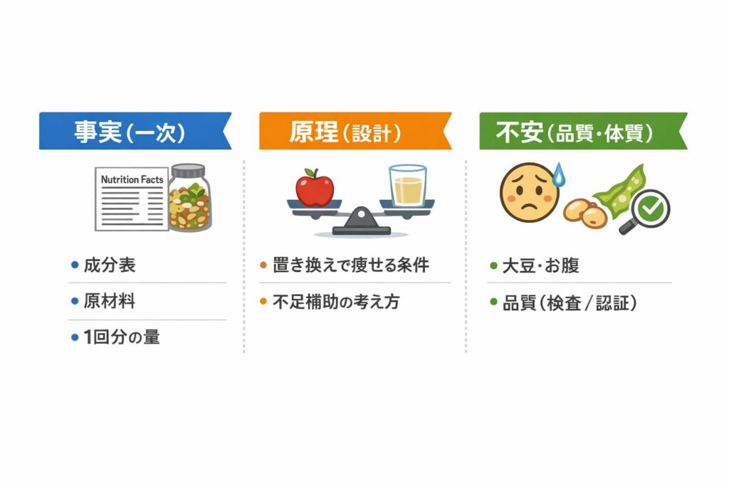 | 体質の不安が整理できた | 大豆・上乗せ・お腹の論点を分けて確認できた | 何が不安か混ざっている | 大豆製品やサプリの重なりを棚卸しする |