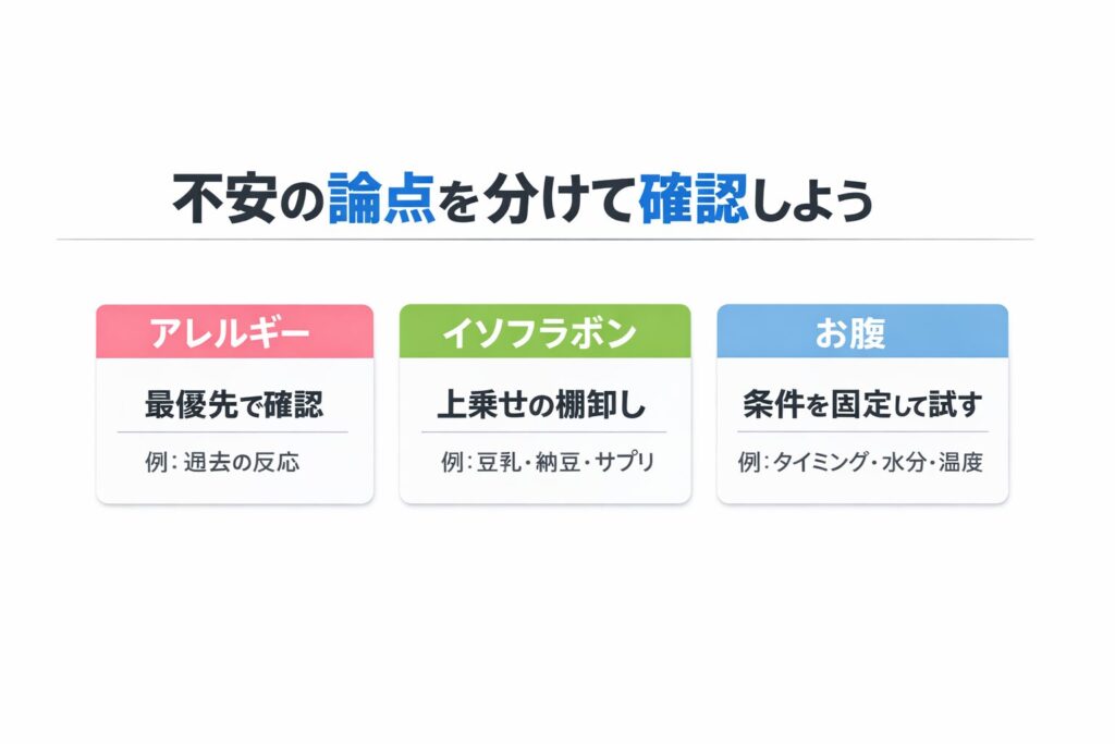 ソイ系で不安が増えるのは、論点が混ざるからです。大豆アレルギー、イソフラボン、お腹の張りやすさは別の話で、確認方法も違います。混ぜたまま考えると、どれも怖く見えてしまいます。