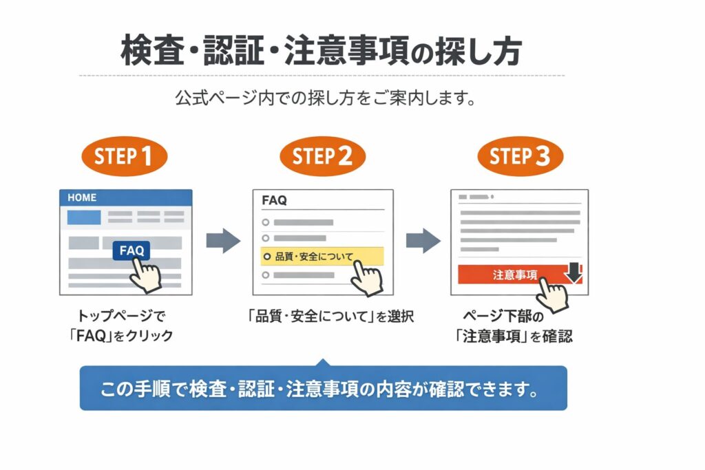 品質の不安は、情報が揃うほど小さくなります。逆に、情報が見つからない状態でレビューを読み漁ると、極端な意見に引っ張られ、迷いが増えます。表の見方は簡単で、「検査・管理・注意」が揃っているかだけ見れば十分です。