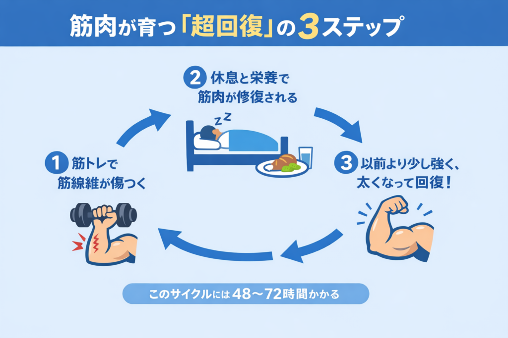筋力トレーニングとは、実は筋肉の線維をあえて細かく傷つける行為です。そして、その傷ついた筋肉が、休息と栄養によって修復される過程で、以前よりも少しだけ太く、強くなります。この「トレーニング頻度」と「超回復」の関係性こそが、筋トレの最も重要な原則です。