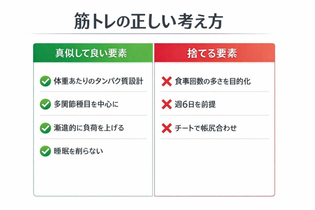 最短ルートはシンプルで、「凄いルーティンを写す」のではなく、筋肉が増える要素だけを抜き取り、体重あたりのタンパク質量(g/kg)と、週に確保できる日数に合わせて組み直すことです。食事回数や週6日の分割は“前提が揃った人の手段”なので、一般の生活に合わせて削っても筋肉づくりの土台は崩れません。