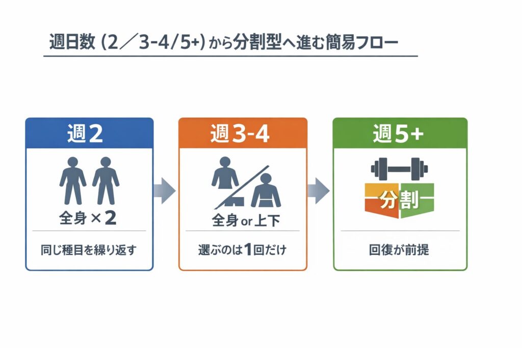 | 2日 | 全身×2 | 45〜70分 | 低〜中 | 仕事が詰まりやすい/まず習慣化したい |