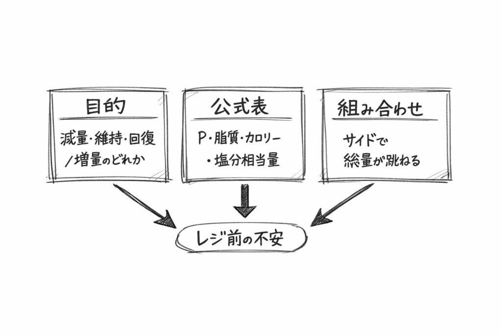 この並べ替えが効くのは、選び方が“好み”から“条件”に変わるからです。減量の日は脂質とカロリーが上振れしないことが最優先になりやすい。維持の日は継続性が重要で、満足感も計算に入ります。回復・増量の日は「タンパク質が取れているつもりでも、総量が足りない」方が問題になります。