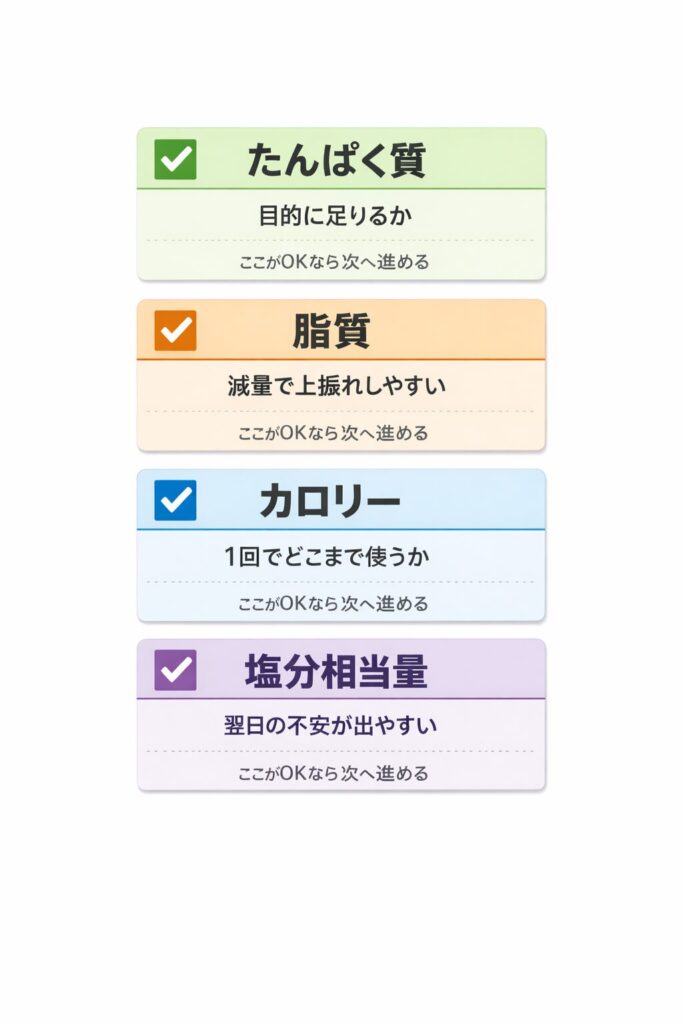 全部を見なくていい理由も、ここで押さえておきたいところです。タンパク質は“取れるかどうか”の判断材料ですが、“取れるから安心”を保証しません。脂質とカロリーが高いと、減量側では調整が一気に難しくなる。塩分相当量が高いと、翌日の体重やむくみの揺れで不安が増えやすい。