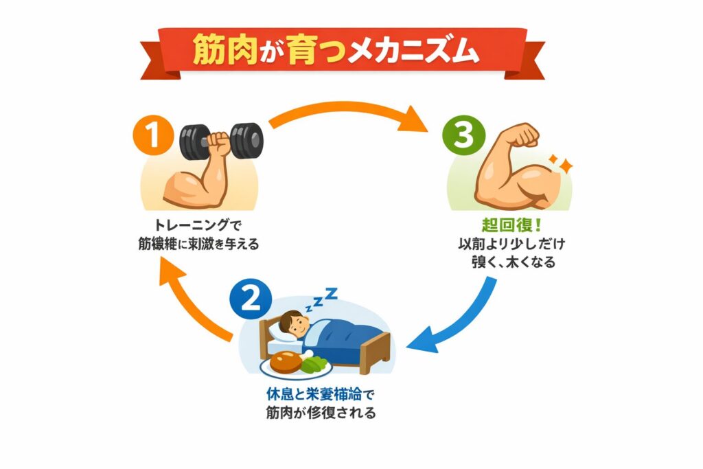 そして、この原則とセットで絶対に知っておくべきなのが「超回復」という現象です。トレーニングで傷ついた筋繊維は、休息と栄養によって修復されます。このとき、以前よりも少しだけ太く、強くなって回復します。これが超回復です。
