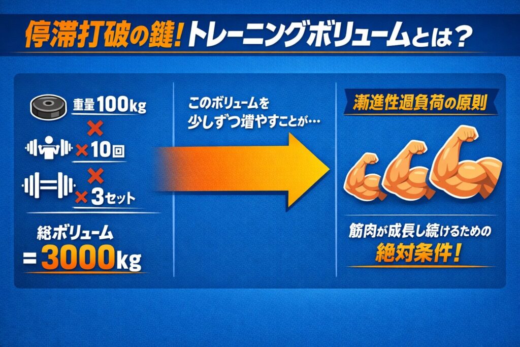 では、計画的な変化とは何でしょうか。その答えが「トレーニングボリューム」という考え方です。トレーニングボリュームとは、単純なセット数ではなく、「重量 × 回数 × セット数」で計算されるトレーニングの総負荷量を指します。