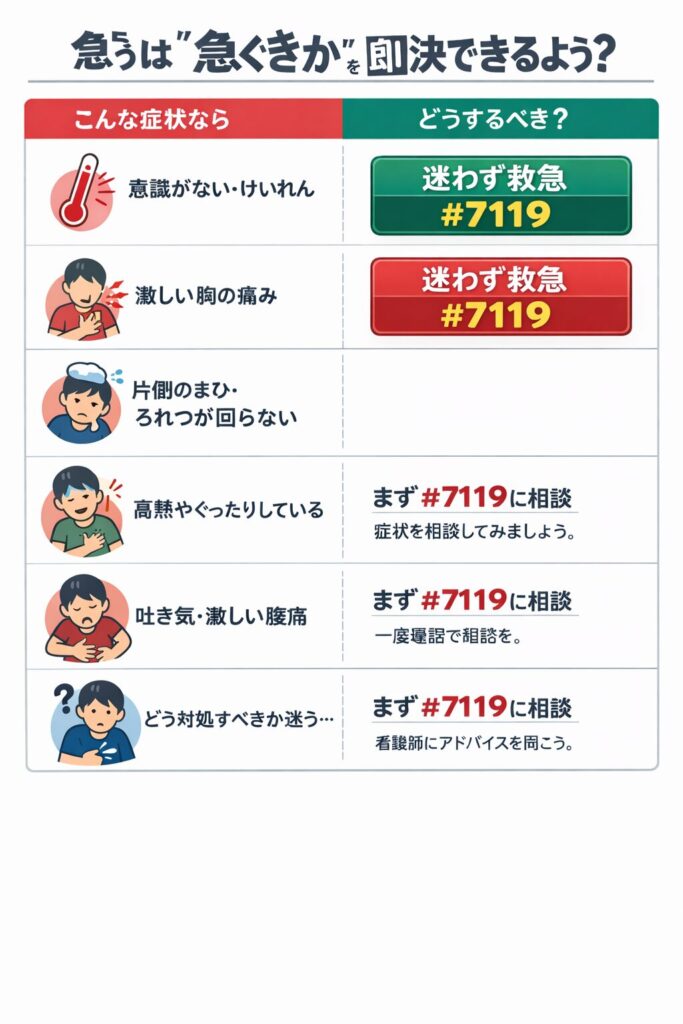 ここで大事なのは、「原因は何か」より「危険サインがあるか」です。危険サインがあるなら、自力で判断を続けるほど遅れます。迷った時点で、救急相談(#7119)に寄せていい。#7119は「救急車?病院?」の迷いを電話で整理してくれる窓口として制度化されています(根拠として 総務省消防庁(♯7119の説明) が概要を示しています)。