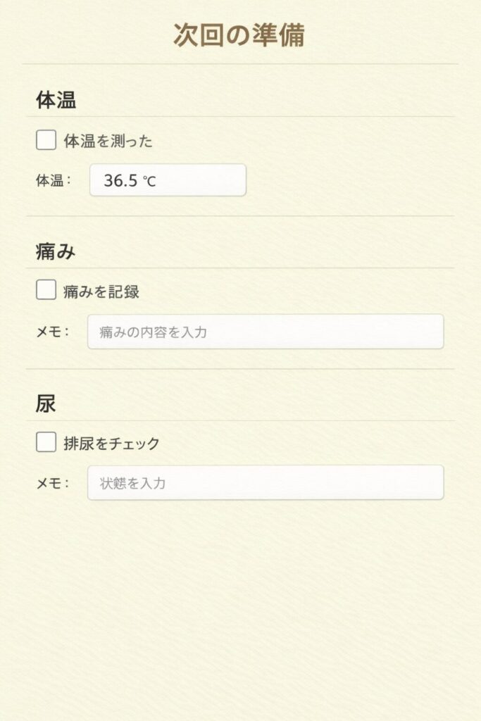 これだけで、相談や受診のときに話が早くなり、「今の状態が悪化しているかどうか」も見えます。