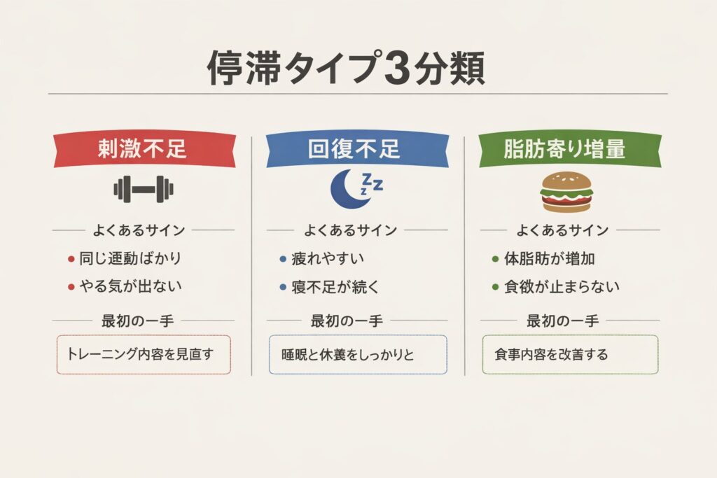 | 停滞タイプ | 典型サイン | まず直す場所 | 最初の一手 |
