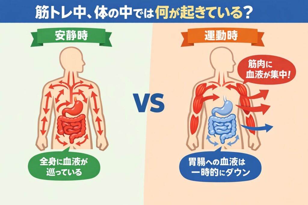 トレーニングで筋肉を追い込むと、体は大量の血液をその筋肉に集中させて、酸素や栄養を届けようとします。この筋トレ中の血流の変化が、下痢を引き起こす原因の一つです。特に、普段運動をしていない方が急に激しいトレーニングをすると、胃や腸といった消化器系の血流が一時的に不足し、消化機能が低下してしまうのです。これは体がトレーニングに慣れていないために起こる現象で、病気ではありません。
