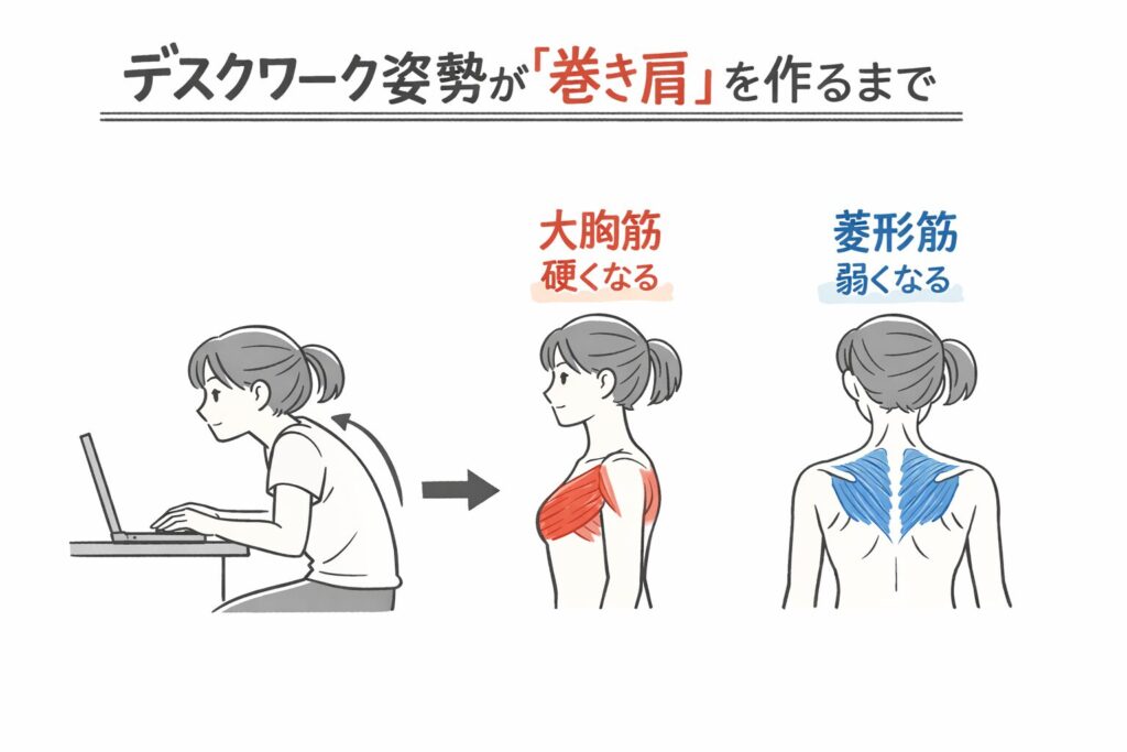 - あなたの肩こりの原因は、デスクワークによる「巻き肩」にあります。
