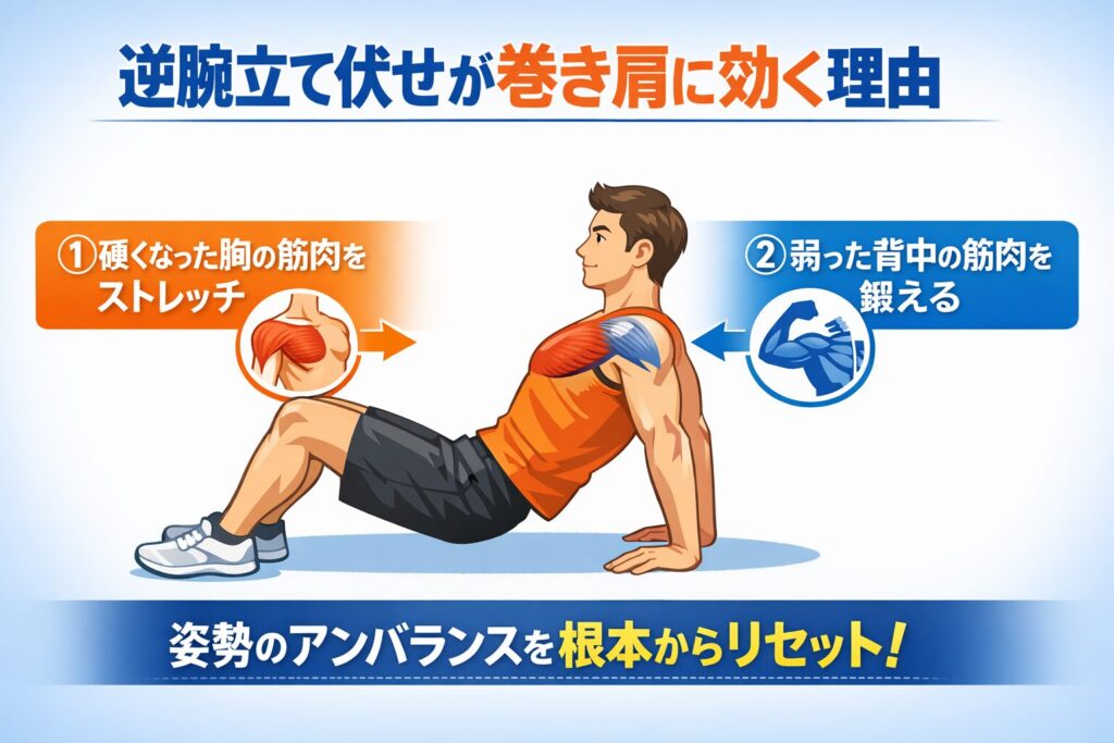 では、どうすればこの巻き肩を改善できるのでしょうか。その答えが「逆腕立て伏せ」です。逆腕立て伏せは、巻き肩を改善するための効果的なエクササイズであり、その理由は、巻き肩の原因である筋肉のアンバランスに、以下の2つの側面から同時にアプローチできる点にあります。