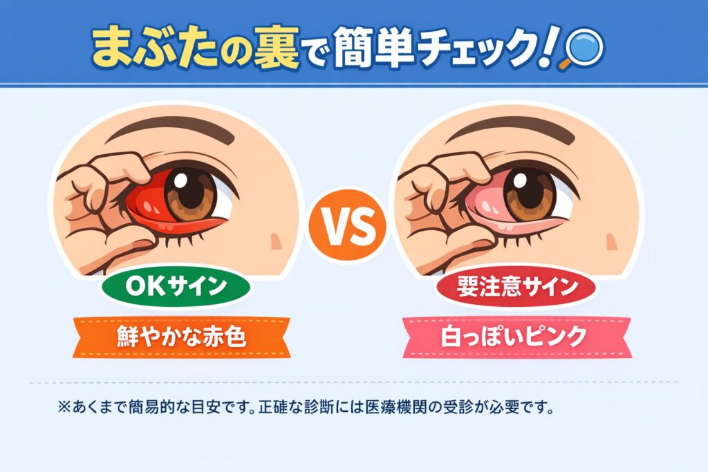 あっかんべーをするように下まぶたをめくってみてください。健康な状態なら赤色ですが、貧血気味だとピンク色や白っぽく見えます。 - □ 爪が白っぽかったり、スプーンのように反り返ったりしている