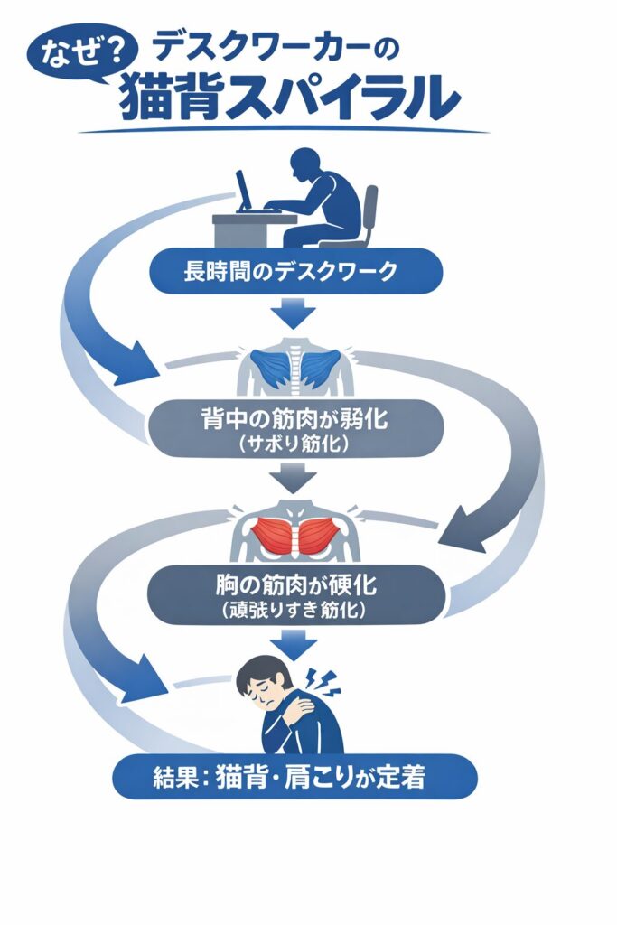 具体的には、デスクワークという行為が原因となり、結果として猫背や肩こりを引き起こしているのです。PC作業中の姿勢を思い浮かべてみてください。背中は丸まり、肩は内側に入り、頭は少し前に出ていませんか?この状態が長時間続くと、身体の中では次のような悪循環、まさに「猫背スパイラル」が起こっています。