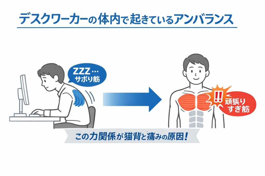 私たちの体は、長時間座り続けることで、あるアンバランスな状態に陥ります。それは、背中側の「サボり筋」と、体の前側の「頑張りすぎ筋」という関係性です。