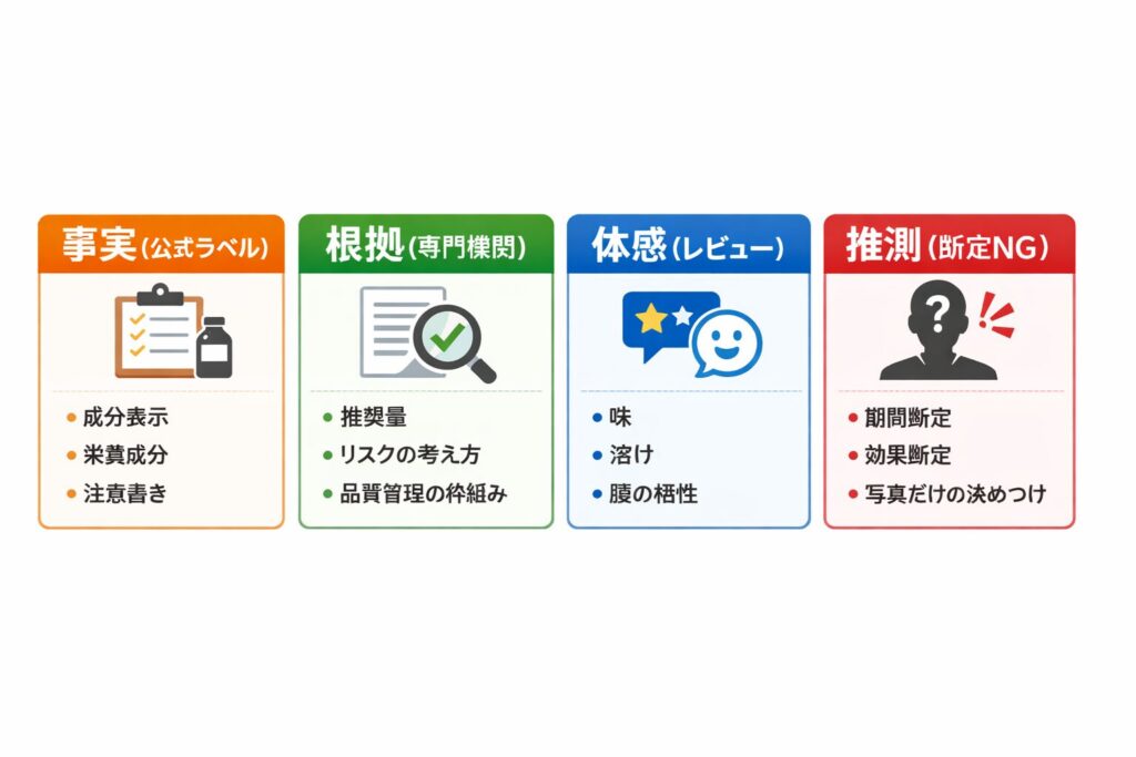 最短で迷いを減らすなら、最初に公式ラベルで事実を固定し、次に権威ある情報でリスクの扱い方を押さえ、最後に体感レビューは相性確認として使う。この順番だけ守れれば、「買う/保留/別案」が自分の条件で決まります。