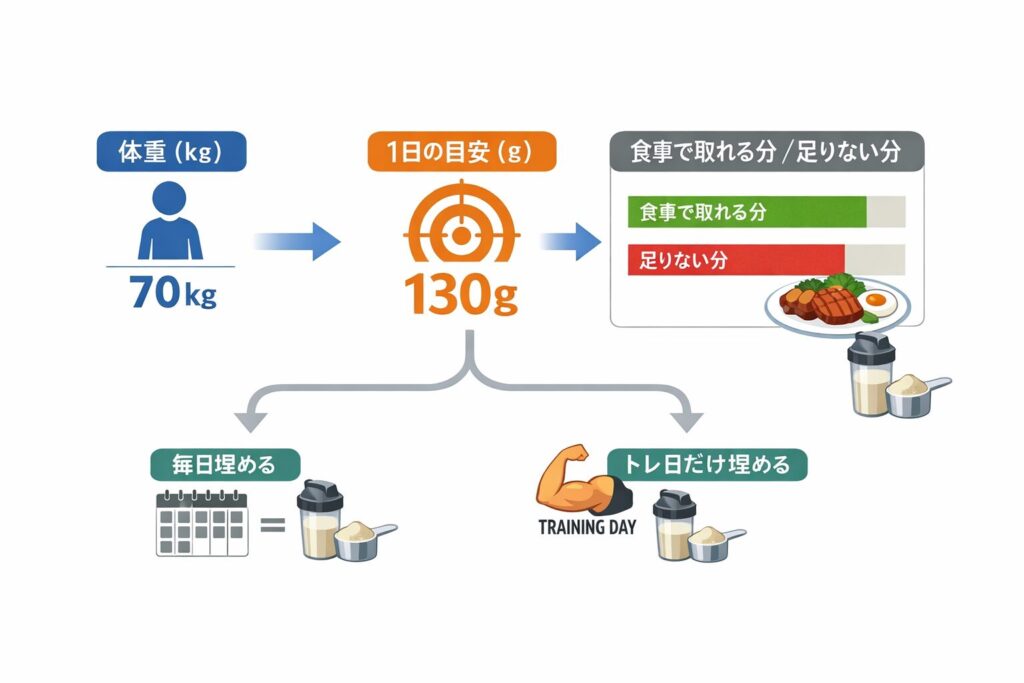 体重×目安(g/日)でざっくり置き、普段の食事でどれだけ取れているかを“雑に”でいいので見積もります。ここで完璧な計算は不要です。大事なのは、足りない分を「毎日埋める」のか「トレ日だけ埋める」のかを決めること。毎日埋めるなら味と胃腸相性が最優先になります。