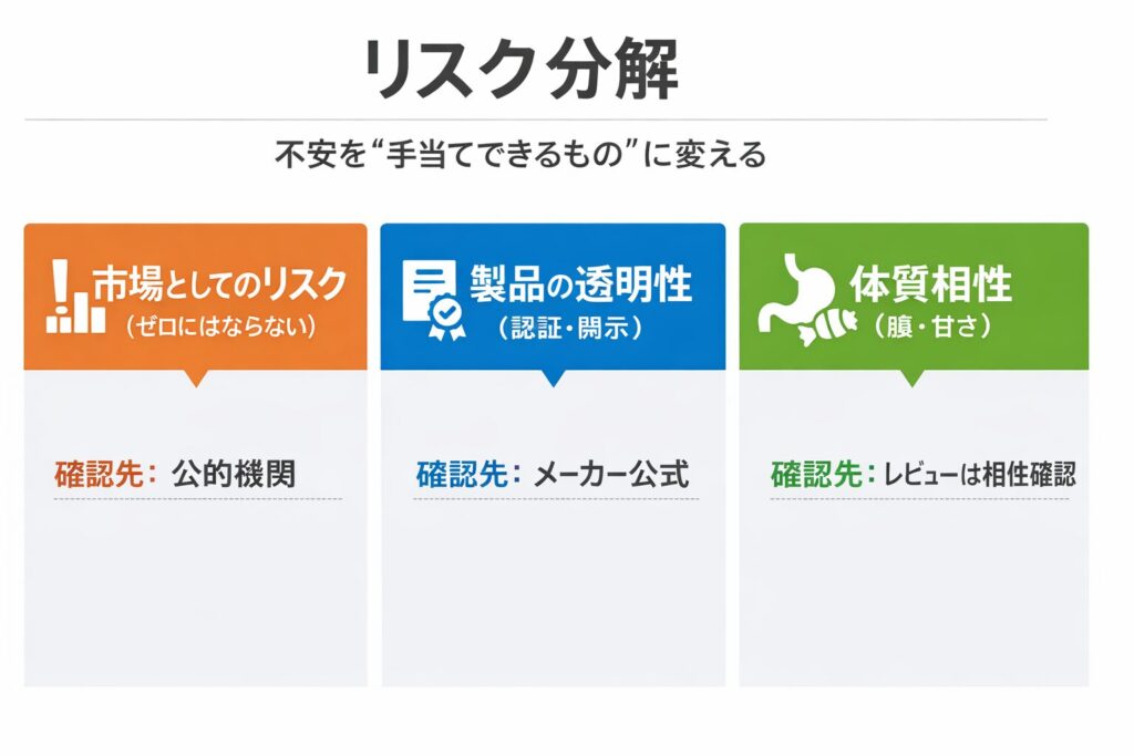 多くの場合、怖さは3つに分かれます。ひとつは品質への不安(混入や表示の信頼性)。ふたつめは体質相性(甘味料・乳由来成分でお腹が崩れる)。みっつめは購入トラブル(届かない、返品が面倒)。この3つを分けるだけで、調べる場所と優先順位が定まります。