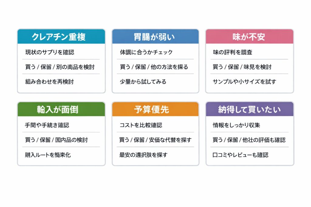 | すでにクレアチンを摂っている | 同梱の有無と量 | 同梱なし優先/同梱でも調整 | まず現在のサプリ運用を書き出す |