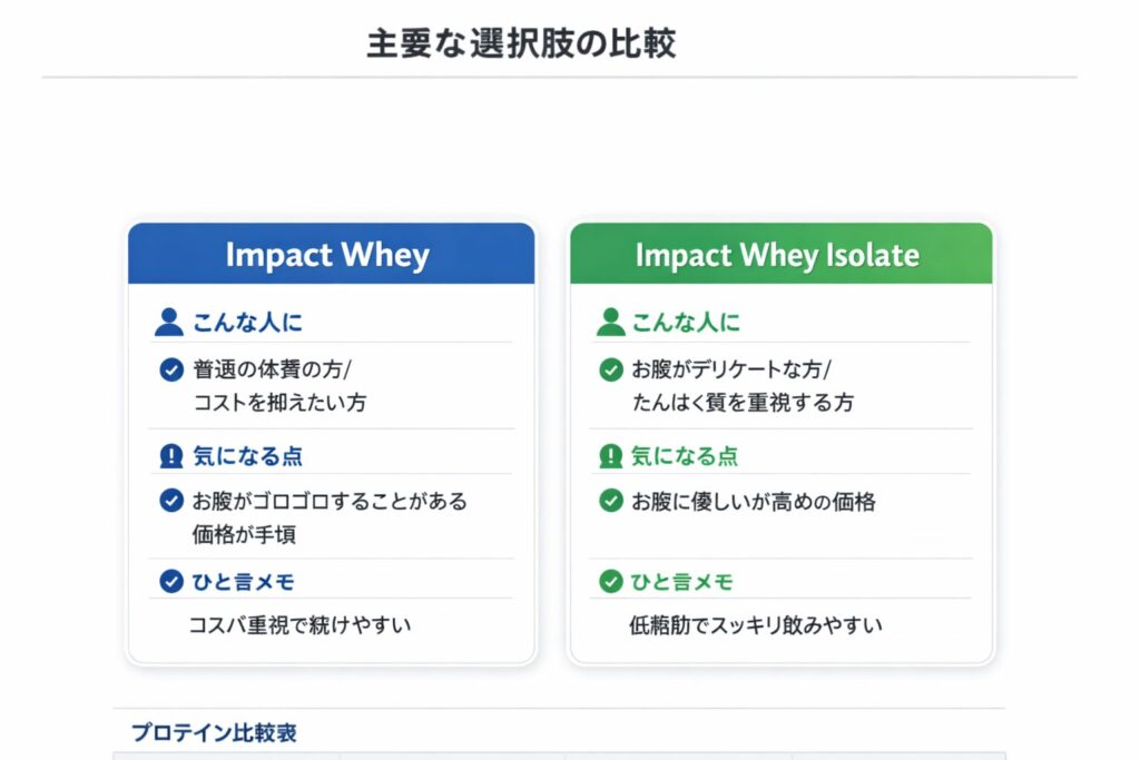 迷いの中心は「同じホエイなのに何が違うのか」に尽きます。一般に、Isolateはより“余計な成分が少ない方向”で作られ、Impact Wheyはコスパと使いやすさのバランスに寄ります。ここを理解すると、価格差が「損得」ではなく「自分の不安を減らすための差」に変わります。