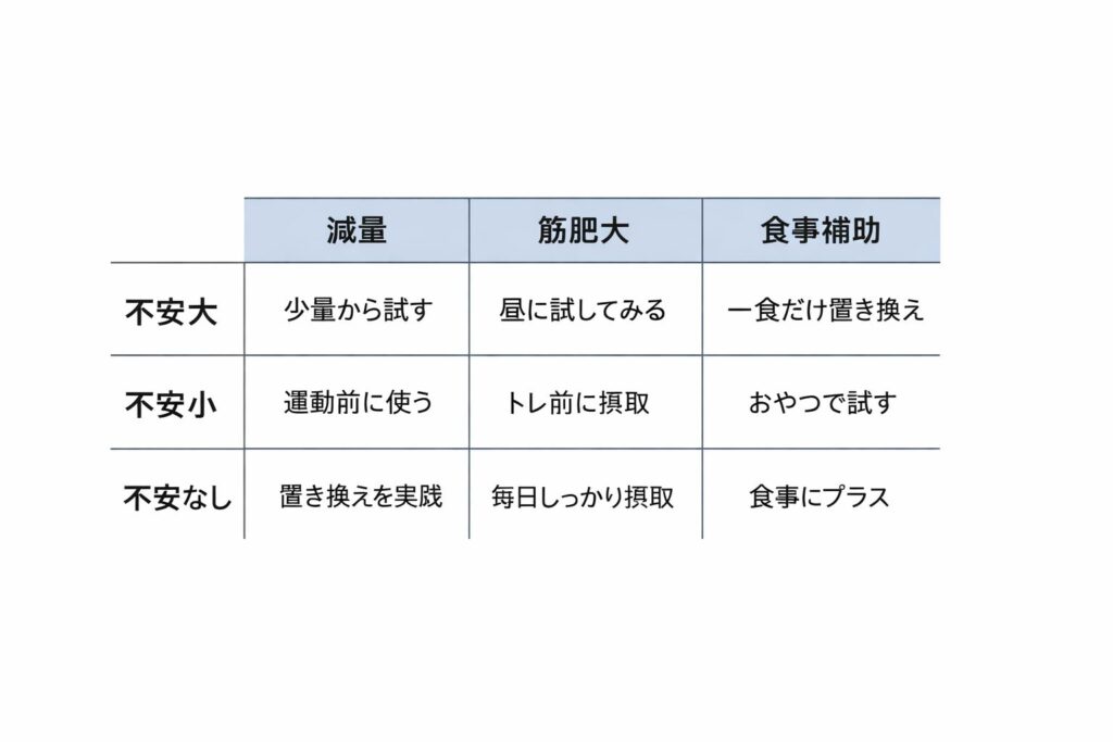 似た場面として、筋トレを始めたばかりの人は「プロテインを飲めば変わる」と期待しやすいです。実際は、飲める形で続くことが最重要です。逆に上級者は、食事が整っている分、補助として割り切りやすい。自分の現在地で決めると納得が残ります。次は、そのまま動ける形に落とします。