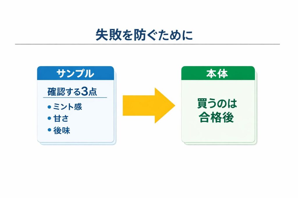 失敗しやすいのは、最初から「みんなが美味しいと言っているから」で本体を買うことです。チョコミントは好みが割れやすいカテゴリなので、少数の否定レビューがあるだけで不安が戻り、届くまで落ち着かない。逆にサンプルで「後味が残らない」「水でいける」を確認できたら、届くまでの不安が減ります。