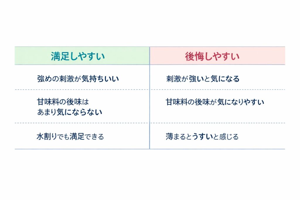 | 後味 | すっと引いて次の食事を邪魔しない | 口の中に甘さが残り続ける | 濃度が高い/割り方が合わない |