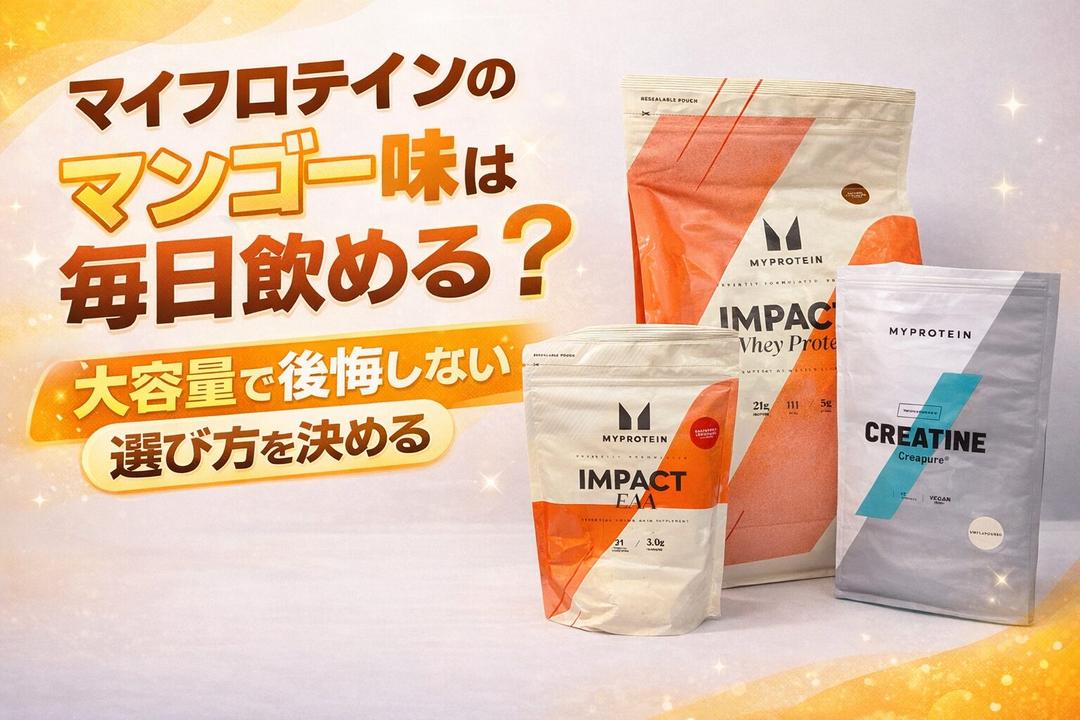 マイプロテインのマンゴー味は、毎日飲める人もいます。ただし、毎日飲めるかどうかは「美味しい/まずい」の感想より先に、甘さ・香りと後味・乳の相性で決まります。買う前にこの3つだけ順番に潰し、最初は少量で確かめる。これが一番後悔が少ない進め方です。